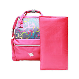 tay organized and stylish on the go with this trendy diaper backpack featuring a fun heart and star print. This spacious backpack comes with a convenient changing mat, providing all the essentials for outings with your little one. The modern pink and grey design with playful graphics makes it a fashionable and practical choice for parents.