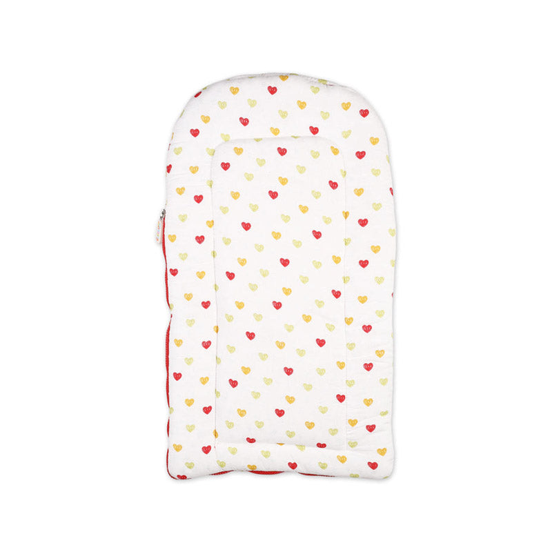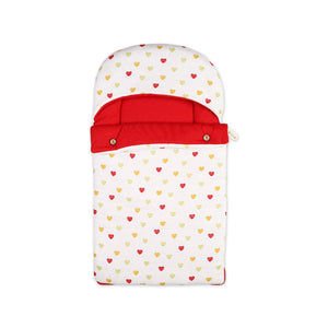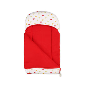 This charming baby carry nest is an ideal blend of loving style and comfort for your little one. The exterior features a cheerful pattern of multi-colored hearts in shades of red, yellow, and green on a crisp white background. Inside, the nest has a soft and vibrant red lining, providing a secure and comfortable space for your baby to rest. The full-length side zipper makes it simple to get them in and out, while the top flap and hood give them extra protection from the elements.